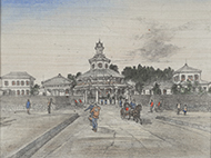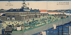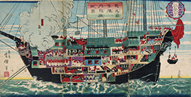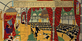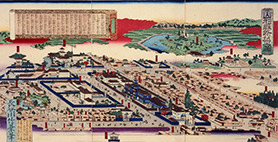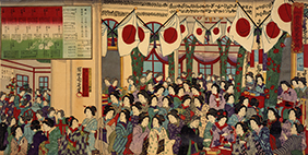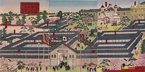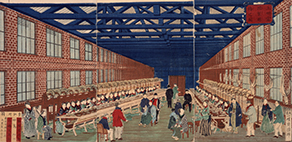 当館では、那須野が原開拓との関連で近代史にスポットを当てていますが、その中で近代の錦絵に着目し、歴史と美術の面から収集をしています。特に明治の文明開化を象徴する作品を中心に、鉄道・眼鏡橋・洋館・博覧会・国会・産業などのジャンルの作品を集中的に収集し、現在約230点を収蔵しています。