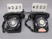 2台の黒電話を使って、ダイヤルを回して電話をかけます。